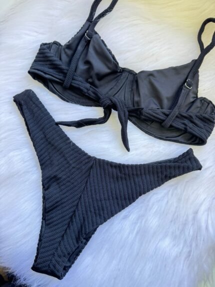 Biquíni Carol é no modelinho cortininha com bojo removível, e calcinha no estilo fita com regulagem nas laterais;