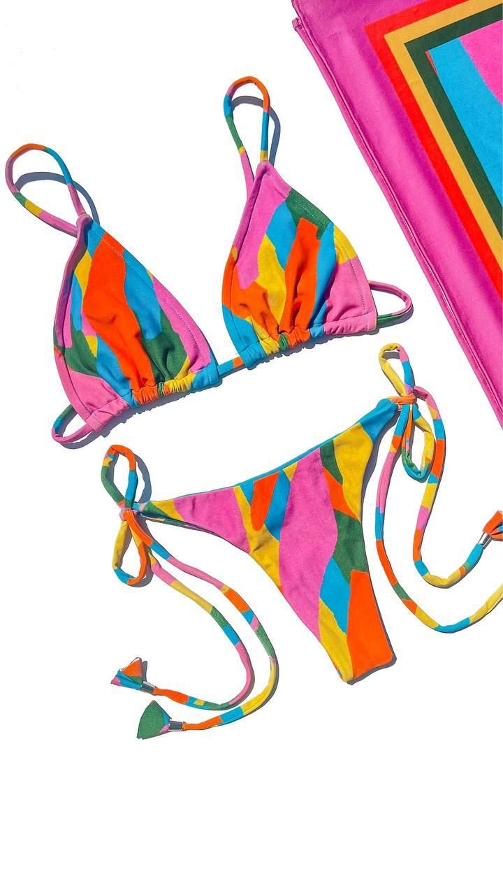 Biquíni cortininha s/bojo, mas caso queira por bojo há uma abertura; E amarração nas laterais;